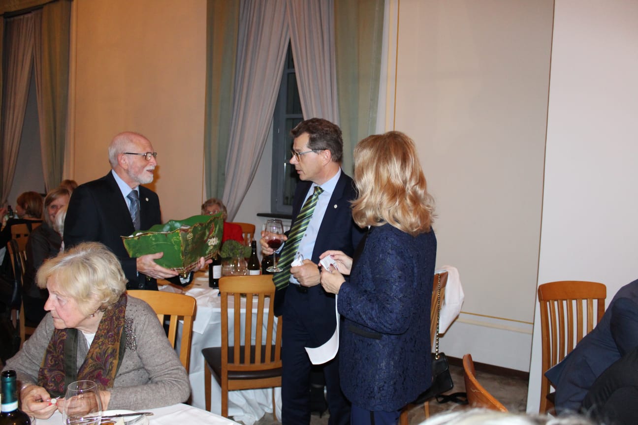 La presidente dell'AIC sig.ra Ingrid de Marinis viene festeggiata con l'omaggio di una bella pianta fiorita consegnata dal Vice Presidente dr. Luigi Contin a nome del Vorstand durante la serata